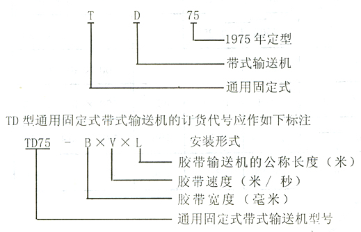 TD型通用固定式帶式輸送機(jī)的產(chǎn)品代號(hào)為TD75,其意義如下: