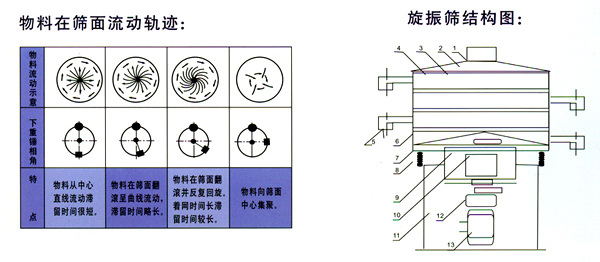 篩體的激振源裝在篩子底部,篩底之上裝有各層篩框及篩網(wǎng)架,各部件緊固后形成整體參振,參振部件由彈簧隔振支撐(橡膠彈簧或圓柱螺旋彈簧)。物料由篩頂部中間孔給料, 排料口在各層篩框側(cè)面, 可任意改變位置。空間相位角與篩面上物料的運(yùn)動軌跡見圖示。